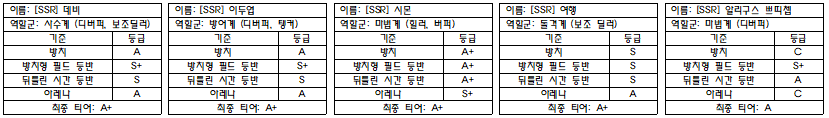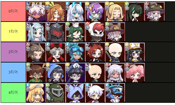 1티어: 나태(탱) / 권진솔(탱) / 아클 벨(힐) / 세실(디버프)