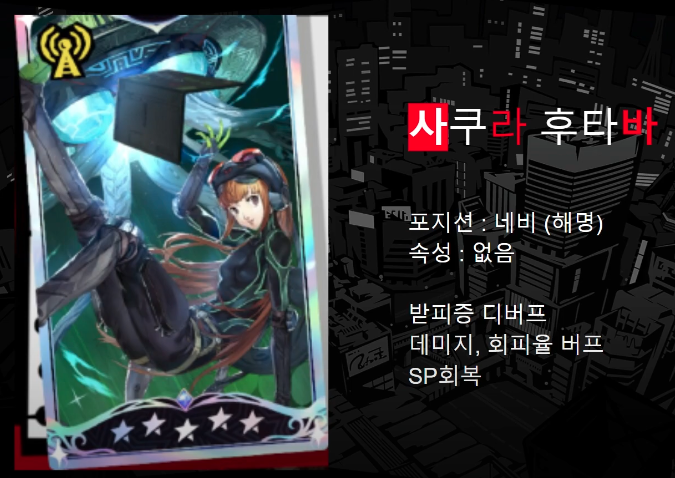 통상 5성 캐릭터. 말이 필요없는 개사기 버퍼 + 디버퍼 상대 방어력을 낮추면서 아군의 딜을 올려주는 캐릭터입니다. 같은 속성인 조커 = 아마미야 렌과 시너지가 너무나도 좋아서 무조건 가져가야 할 캐릭터. 그냥 써도 개사기인 디버퍼입니다. 약간 스타레일 브로냐 같은 녀석.. 아마 한동안은 계속해서 사용할 듯.. |