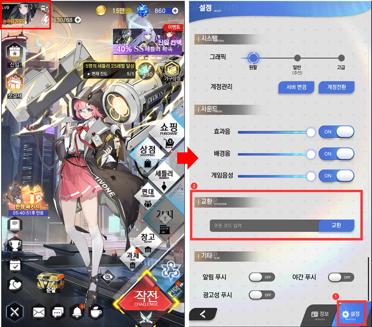 2. [설정] - [교환]을 통해서 쿠폰 코드를 입력해 주시면 됩니다.