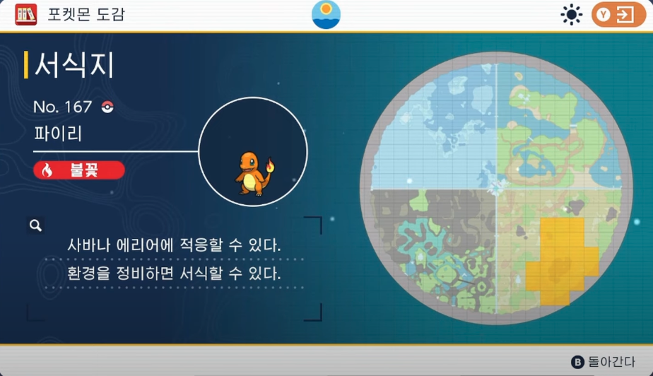 | 사바나 에리어 | 파이리, 리아코, 주리비얀, 푸흐꼬, 나몰빼미, 울머기 |