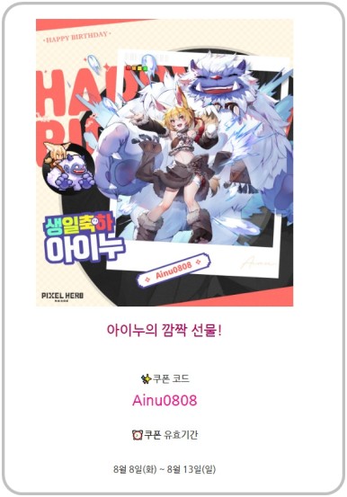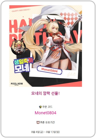 픽셀 히어로 모네와 아이누의 캐릭터 생일 기념 쿠폰 코드입니다.