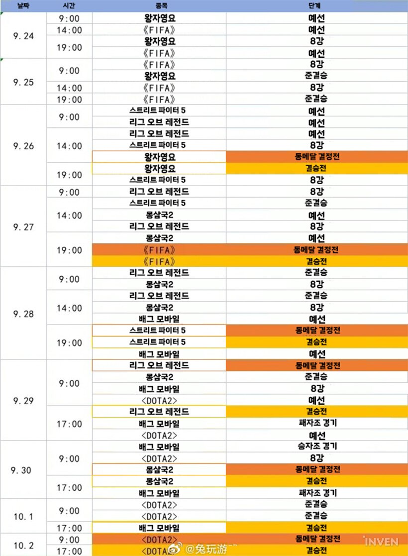 항저우 아시안 게임 E 스포츠 리그 오브 레전드 대회 일정