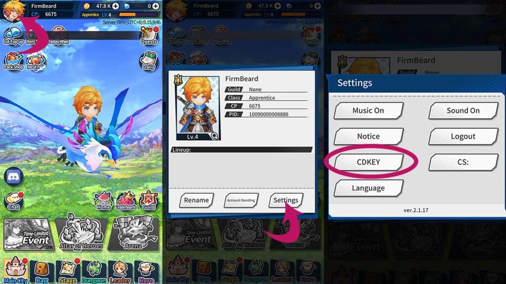 - 게임 접속 후 상단 좌측 프로필 - 설정 - 쿠폰 입력 버튼을