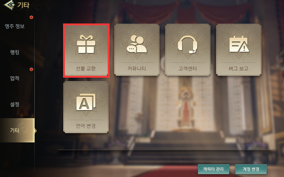2. [기타]에 들어가서 [선물 교환] 클릭.