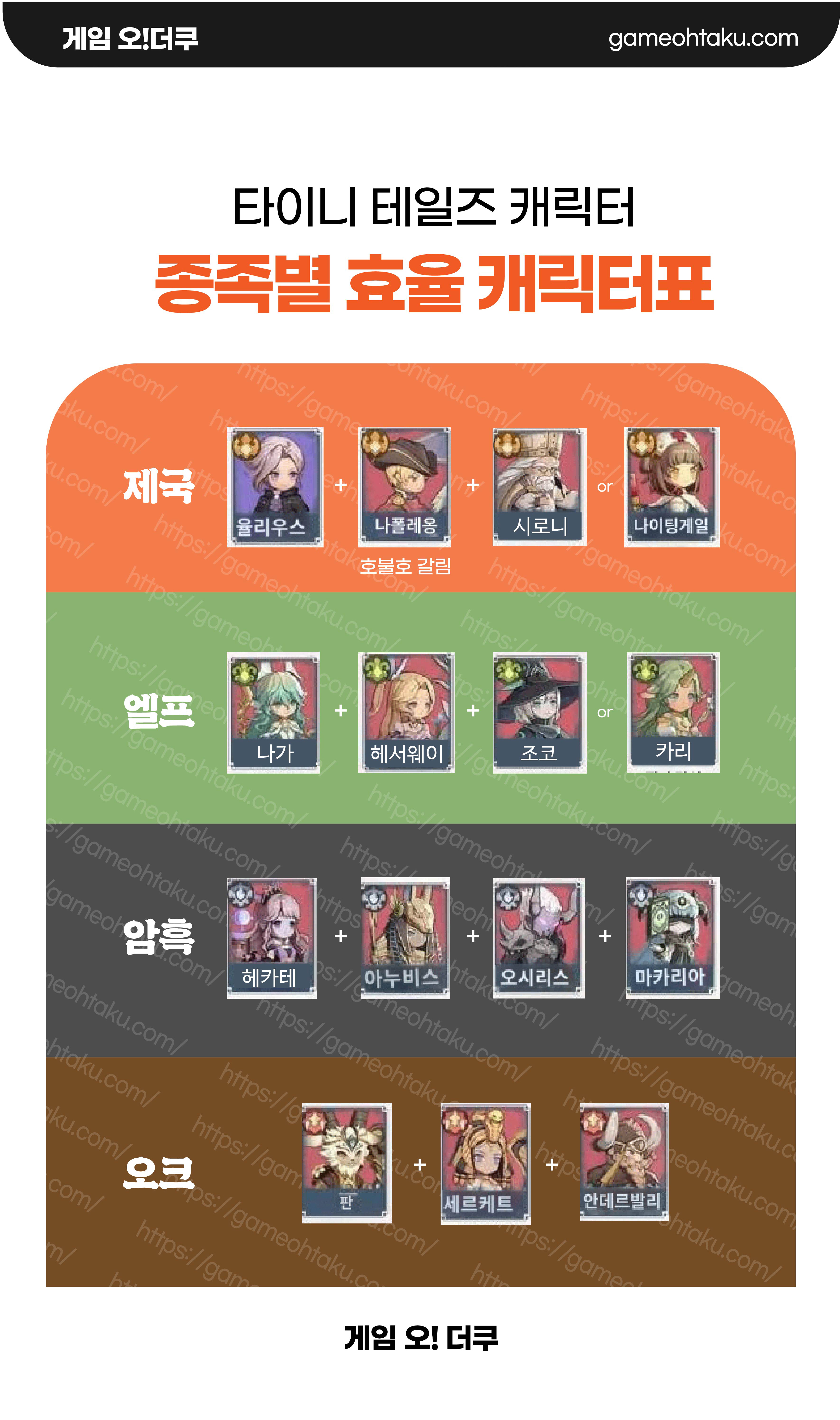 오늘은 타이니 테일즈 종족별 진영 캐릭터 중 효율적인 티어 등급표를 가져왔습니다.