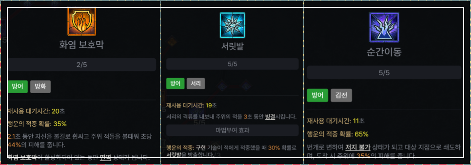 그런데 속성을 통해 한 번 더 공격하거나 재사용 대기시간을 줄여서 사용하고 있는 스킬입니다.