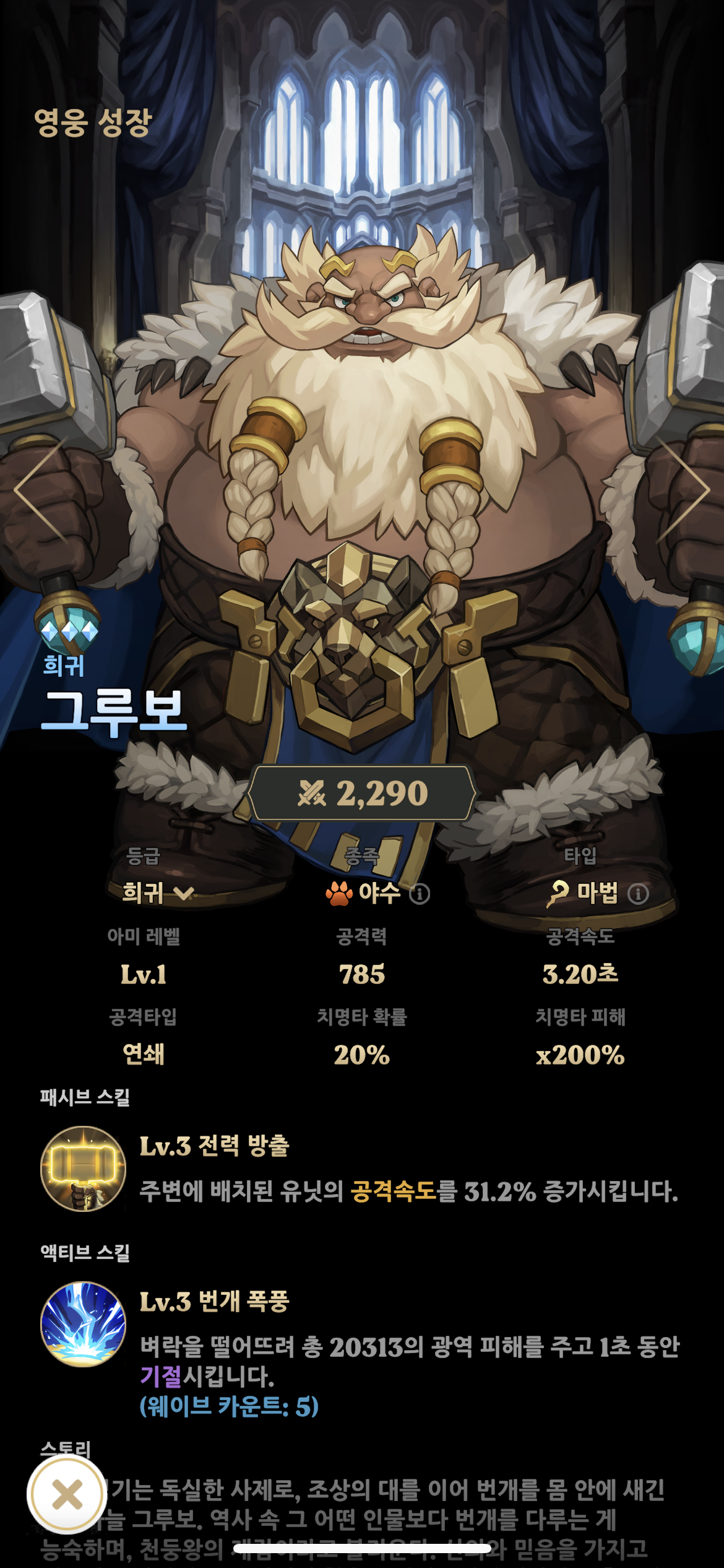 그루보는 그 초반 객사를 영웅 스킬로 막아줍니다.