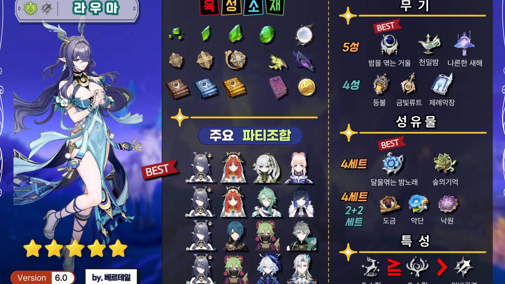 원신 : 라우마 성능 세팅 무기 성유물 파티 조합 별자리 추천 공략 가이드
