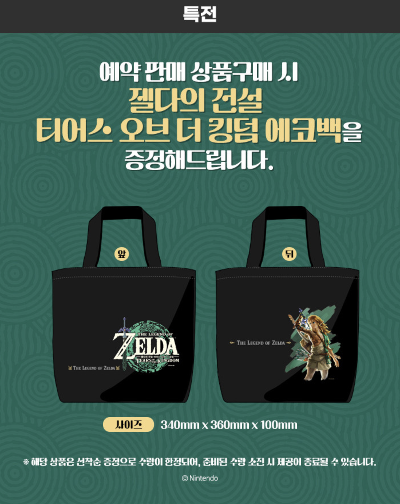 일반판 패키지 예약구매 시 특전으로 젤다의 전설 티어스 오브 더 킹덤 에코백을 증정하고 있습니다.